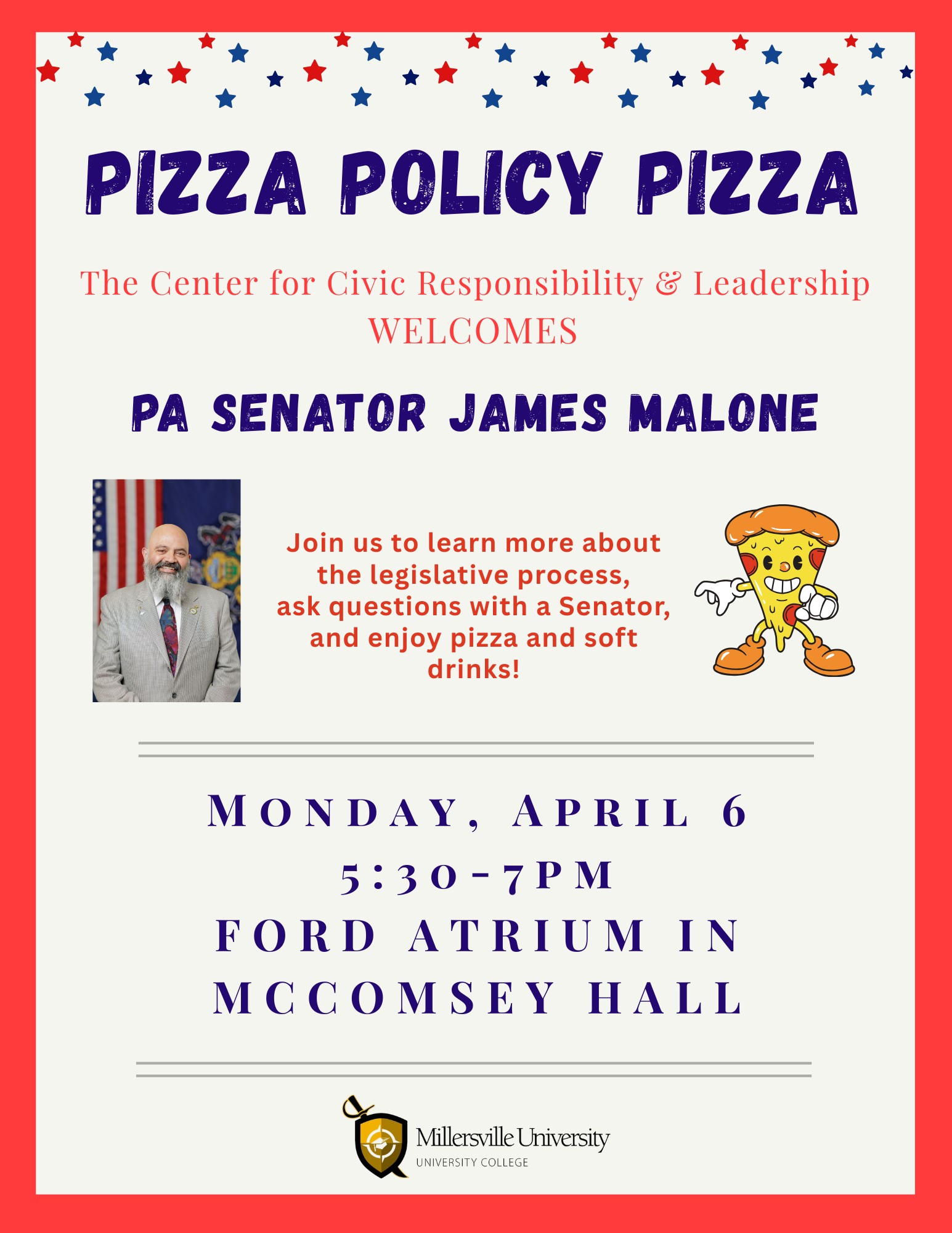 - Monday, 4/6 - 5:30-7pm - @ Ford Atrium in McComsey Hall - Pizza Policy Pizza with Senator James Malone! Open to all students. Click here for the event flyer: