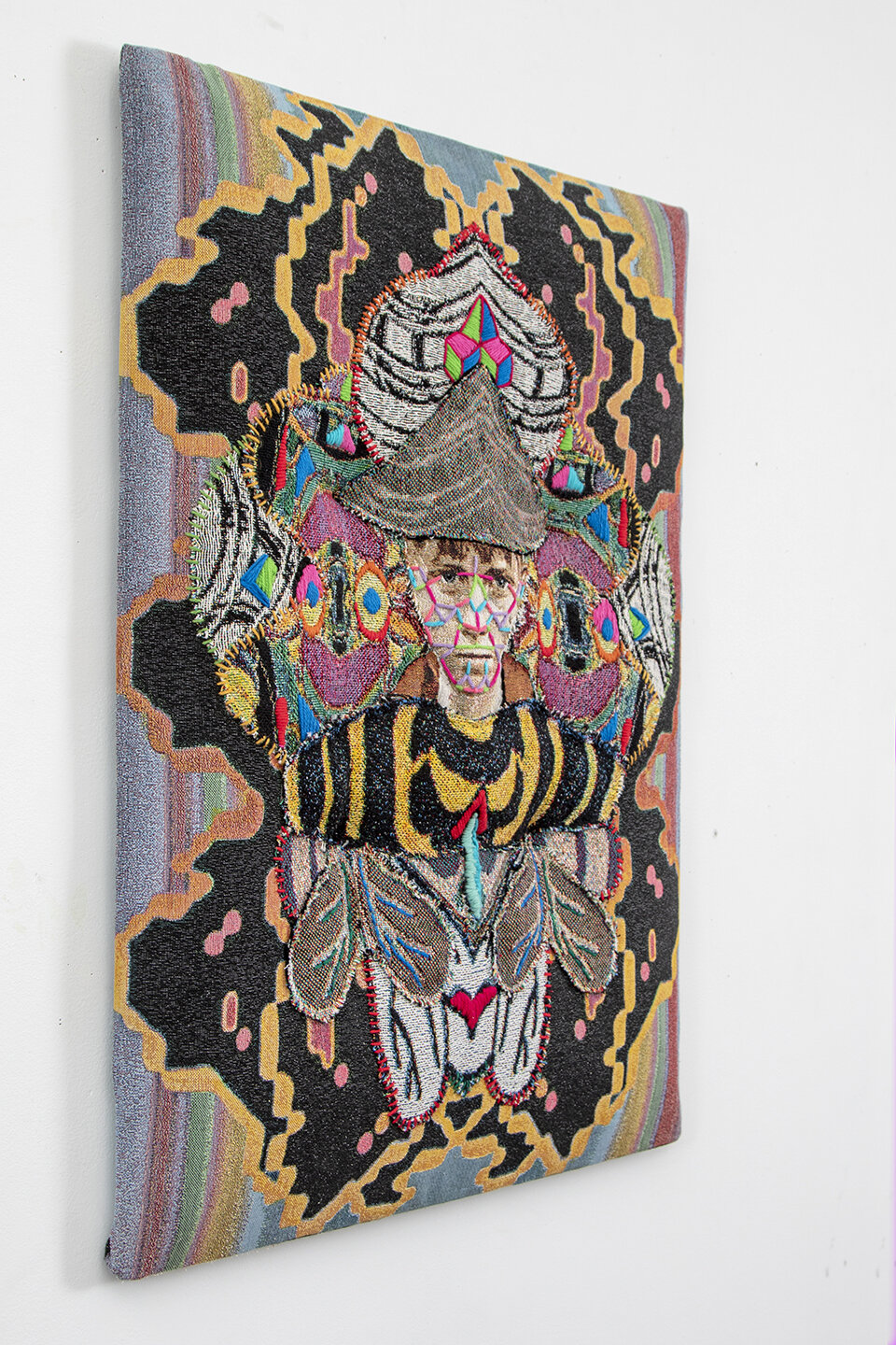 Digitally woven cotton with polyester, embroidery, pigment and crystals on wood mount | 33 x 25 x 4 in.